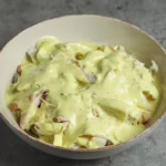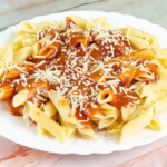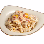 8,40€Ζυμαρικά με κόκκινη καυτερή σάλτσα, μπέικον, κοτόπουλο, κεφαλοτύρι