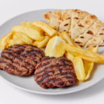 6,50€2 μπιφτέκια, συνοδεύονται με πατάτες τηγανιτές