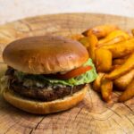 7,90€Μπιφτέκι, gouda, ντομάτα, κρεμμύδι, iceberg, μαγιονέζα, πατάτες και μουστάρδα